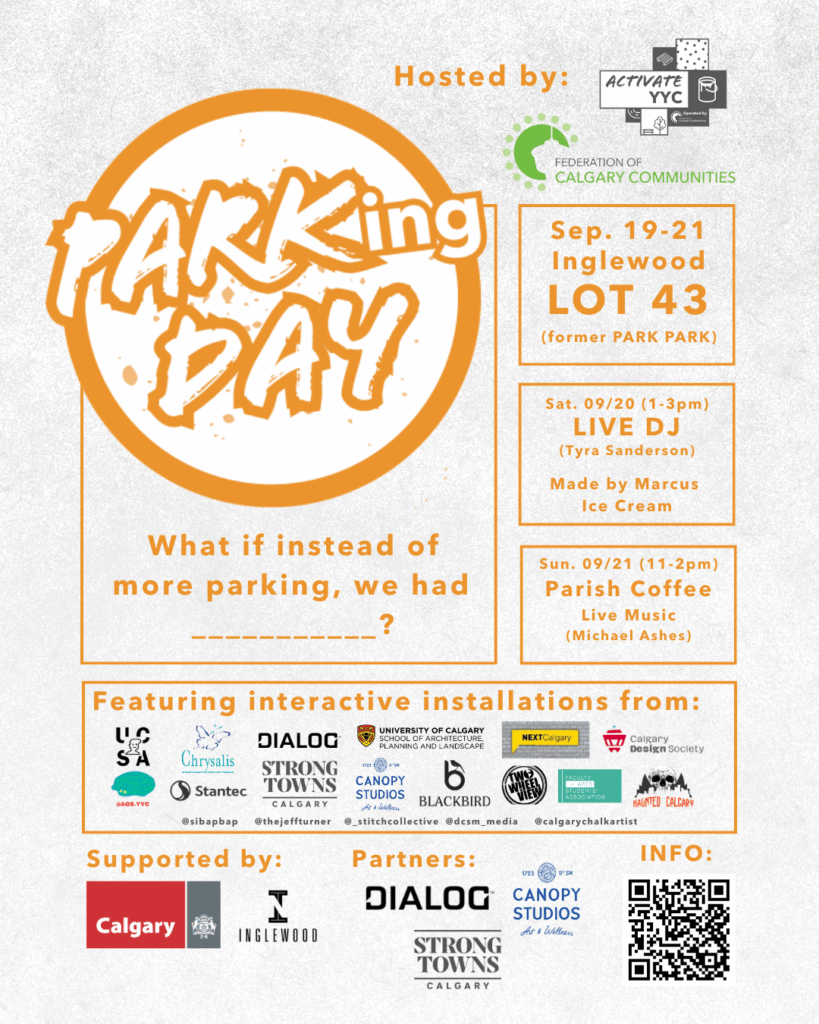The City of Calgary ran Park(ing) Day from 2017-2021, and after a brief hiatus, ActivateYYC reimagined the event in 2024. Hosted in partnership with the Kensington BIA. Join us Sept 19-21, 2025 in Inglewood!